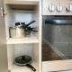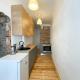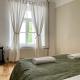 Inside the apartment, guests will find hardwood parquet flooring throughout along with two beds spread across one living room and one separate bedroom. The private bathroom features a shower, hairdryer, body soap and toilet amenities. A fully equipped kitchen includes an oven, stovetop, refrigerator, electric kettle and all necessary kitchenware for meal preparation. Additional comforts include heating, non-feather pillows (synthetic), towels provided on arrival as well as an iron for convenience.