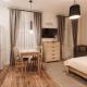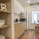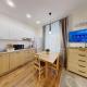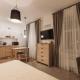 L'appartement dispose d'une kitchenette entièrement équipée avec plaque de cuisson, micro-ondes, réfrigérateur et ustensiles nécessaires pour préparer vos repas. Un plateau avec bouilloire électrique complète cet espace repas agrémenté d’une table à manger et d’une chaise haute pour enfants. La chambre est aménagée avec un lit unique et bénéficie d’un mobilier fonctionnel comprenant un bureau, une armoire ou penderie ainsi qu'un coffre-fort. L’équipement inclut également un lave-linge pratique ainsi qu’un fer à repasser.