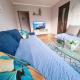 Interiér zahrnuje jednu ložnici oddělenou od obývacího pokoje s rozkládací pohovkou. K dispozici je kompletně vybavená kuchyň s lednicí, varnou deskou, troubou a mikrovlnnou troubou doplněnou jídelním stolem. Součástí vybavení jsou i příslušenství na přípravu čaje a kávy či pračka. Koupelna obsahuje vanu i sprchu spolu s bezplatnými toaletními potřebami jako šampon nebo fén.